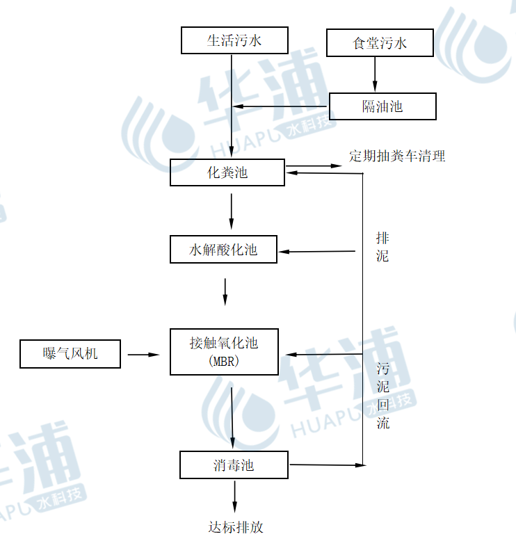 根據(jù)進水水質(zhì)、水量及排放標準和建設(shè)單位提供的施工要求,分析對比現(xiàn)有各種污水處理技術(shù)的特點,同時結(jié)合我方大量的同類工程設(shè)計施工經(jīng)驗,確定本工程采用地埋式一體化設(shè)備,主要工藝采用A/O+MBR,該技術(shù)在確保出水穩(wěn)定達標的基礎(chǔ)上,運行維護簡單方便。