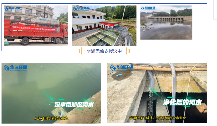 作為環保裝備國家級高新技術企業,華浦環保以“技術救災”為使命,自主研發的應急供水設備先后參與甘肅舟曲縣飲水保障、榆林市吳堡縣脫貧攻堅農村飲水安全、延安市“母親水窖”、銅川市抗旱、寶雞市鳳縣洪澇災害應急供水、漢中市應急供水等10余次任務,為群眾用水提供保障。
